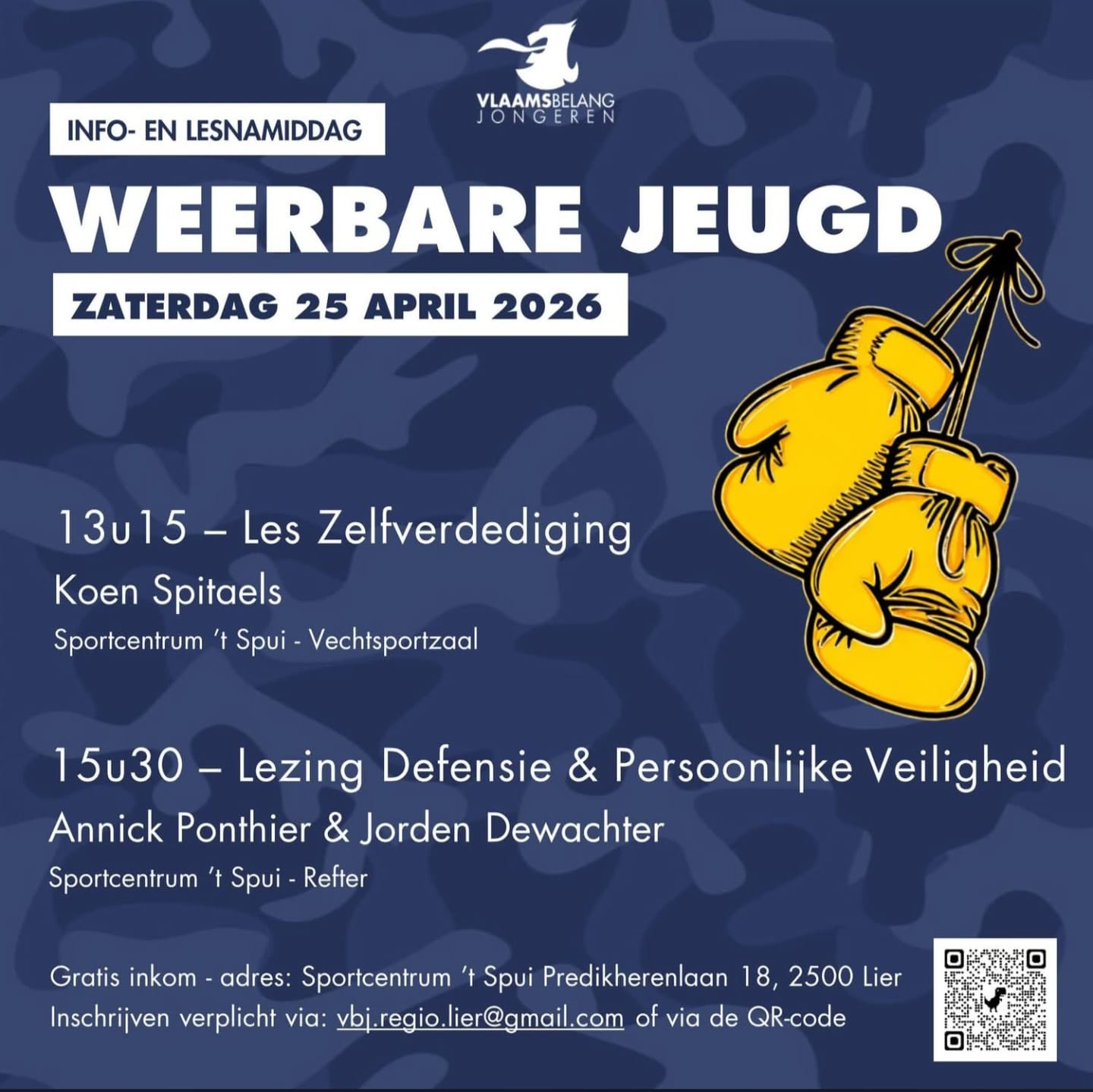 De activiteit vindt plaats in Sportcentrum ’t Spui, Predikherenlaan 18 in 2500 Lier. De toegang is gratis. Inschrijven kan via vbj.regio.lier@gmail.com of via de QR-code op de affiche. Wie belangstelling heeft voor zelfverdediging, veiligheid en weerbaarheid, kan er op 25 april terecht voor een goed gevulde namiddag.